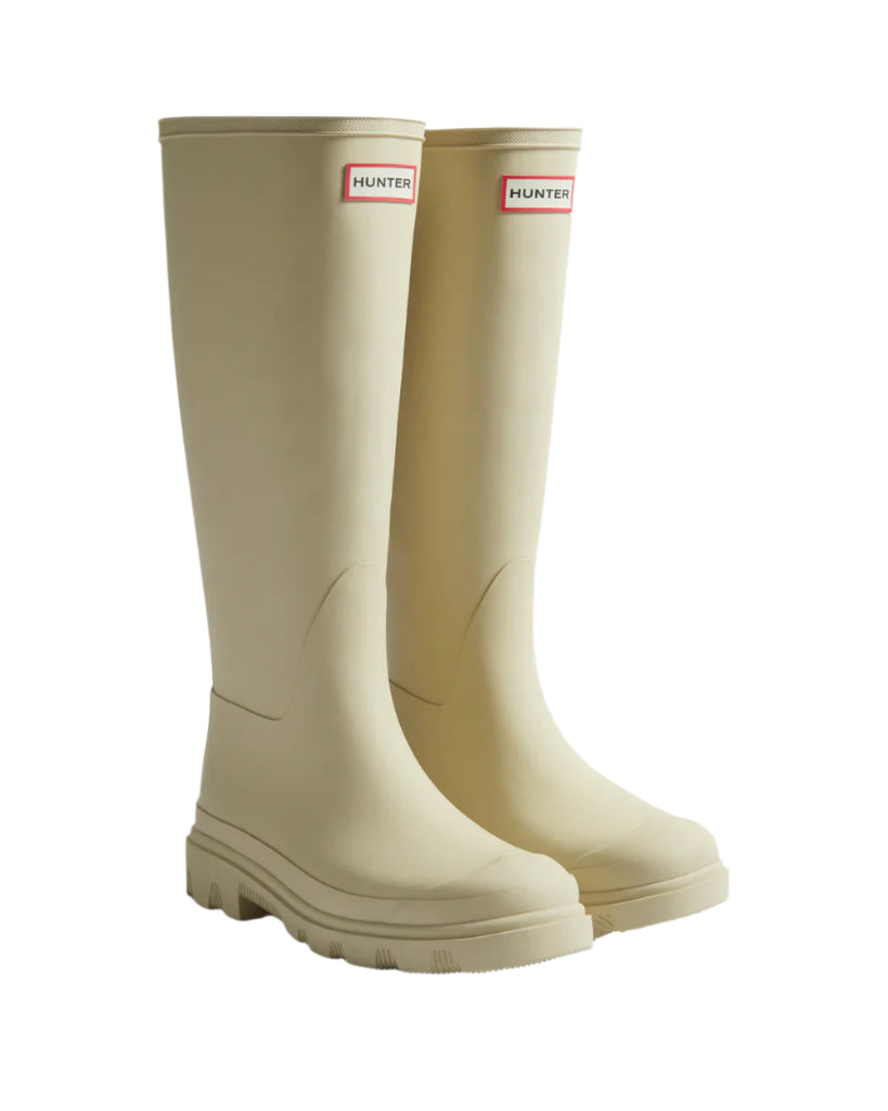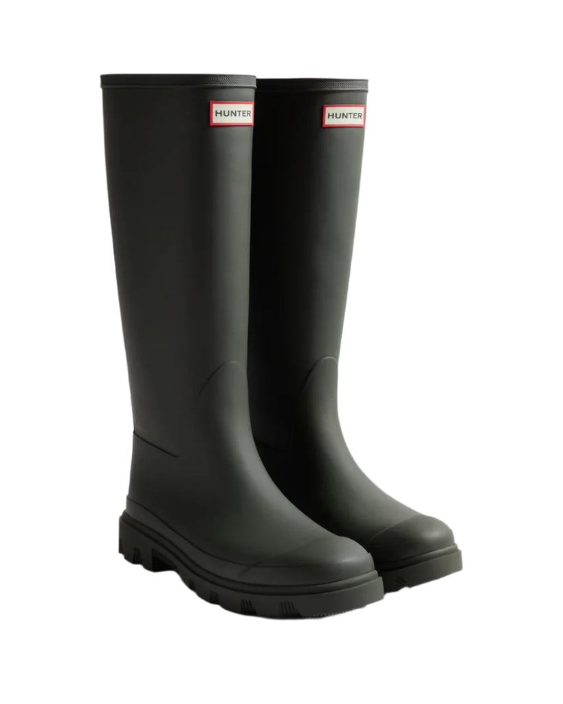 Introducing the newest addition to the Hunter family, our fully waterproof Women's Downpour Tall Boot. With a sleek upper design and a lightweight moulded outsole, the unique tread has taken influence from natural shapes found in landscapes. Handcrafted and finished with a heritage topbind, this women's black riding boot has been engineered to have a more modern and voluminous calf fit.