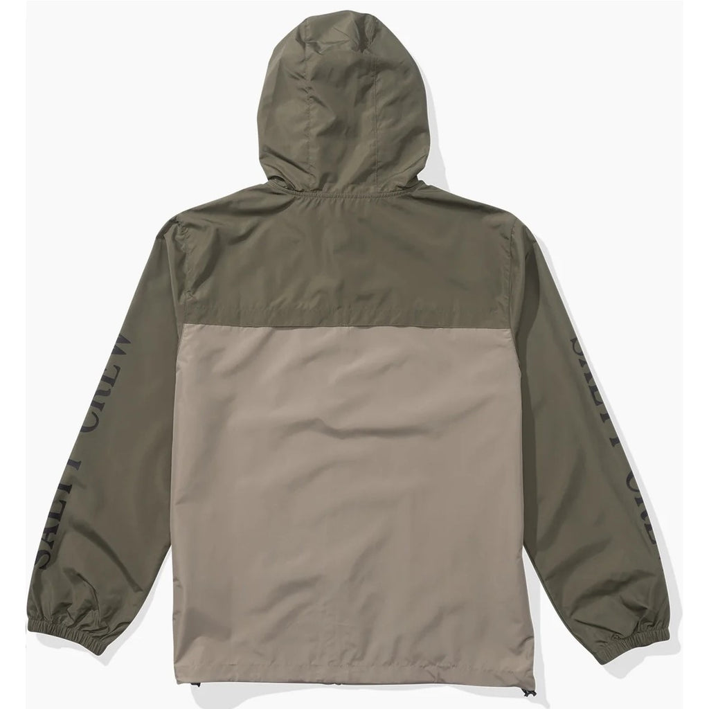 The Surface Windbreaker Jacket in Olive is a midweight shell jacket designed for performance. It features zippered pockets, a mesh-lined hood, and contrast lower panels for added style. The vented back yoke enhances breathability, while the chest and sleeve prints add a bold touch, making this jacket both functional and fashionable.