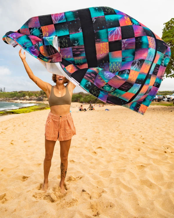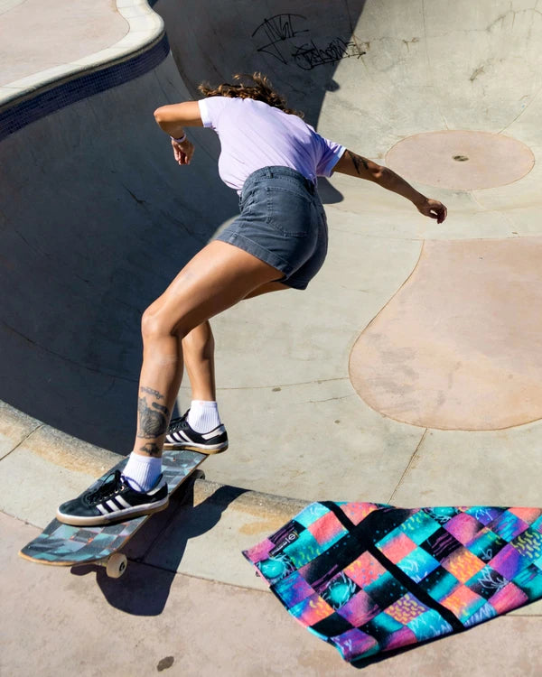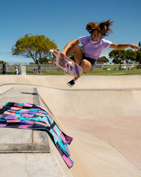 Nora Vasconcellos is taking back skateboarding. She's also taking back the beach. Using grip tape and some paint, she made her debut LEUS Beach Towel to match the art she creates for her skateboards. And it's as fierce and fun as she is.