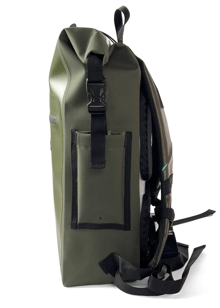 Sleek dry backpack. The North Seas 18L Backpack is constructed with durable polyvinyl front and back panels, 600D PU coated side panels with full welded seams. Design includes water resistant front pocket and mesh side pockets. Top of bag is designed to roll shut and clip secure with nylon buckle to keep contents dry. Backpack features Vissla's Air Crossover padded back to keep moisture away from your back. 30x18x73cm