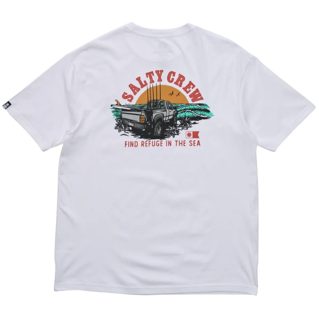 The Lifted Premium SS Tee in White is crafted from ring-spun cotton jersey, weighing 160gsm. It features a Salty Crew clamp label at the sleeve hem and is finished with screen-printed designs on both the front and back for a clean, stylish look.