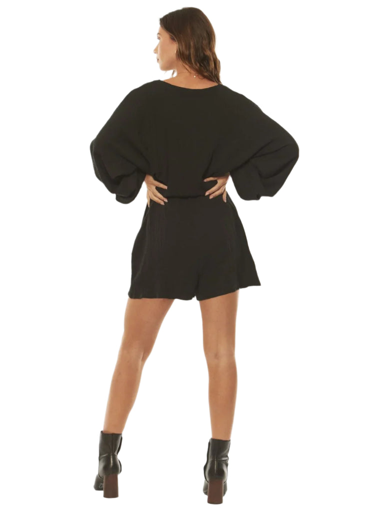 Experience luxury and effortless chic with our Fae Long Sleeve Woven Romper! Made from lightweight, airy fabric, this romper features an elastic waist and tie for a perfect fit. The open, flowy sleeves add a sultry touch, making it a go-to piece for sunny days at the beach or pool. Take risks and turn heads in this stunning romper!