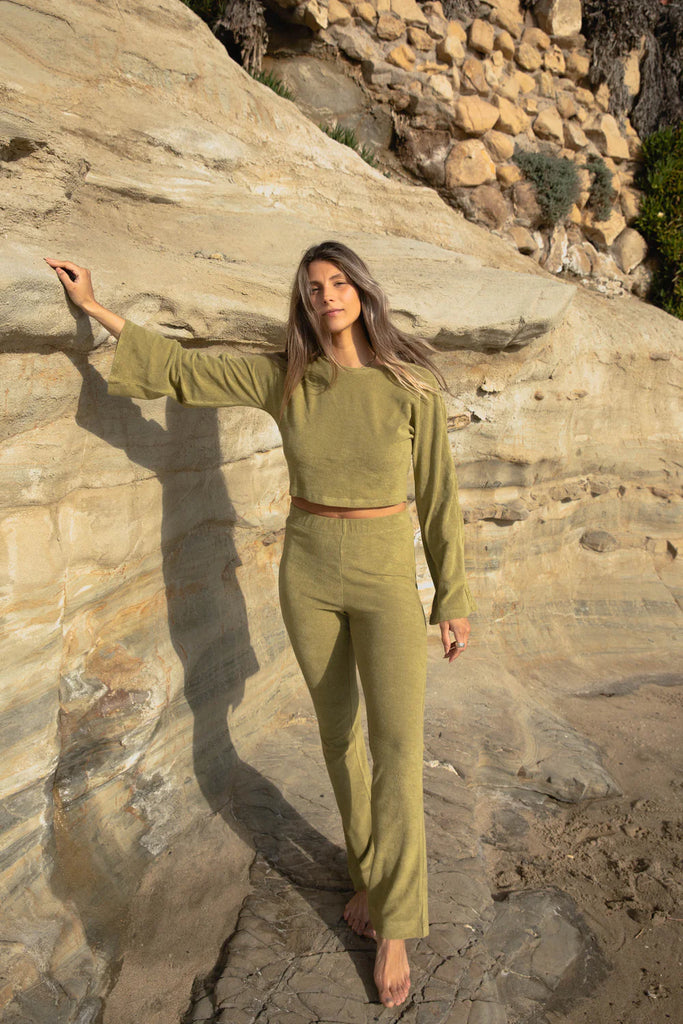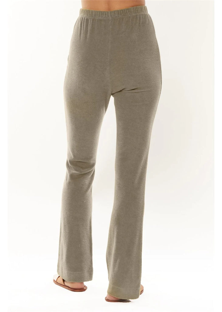 Kairo Pant is a fitted knit pant with a fit and little flare leg shape. She has an elastic waist and is made in a poly cotton terry.