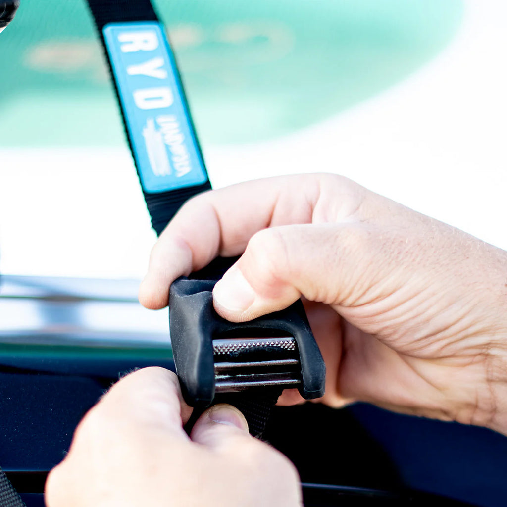 Ryd tie downs come in three easy sizes to choose from - the longer you go, the more boards you can stack on the roof! Featuring industrial, corrosion resistant cam buckles that we've wrapped in moulded silicone so you don't scratch your car and heavy duty 3mm UV coated webbing, all packed up in a handy little reusable storage bag for you to use. Or just throw the tie downs in the boot and use the bag to stash your wax, combs and fin keys for safekeeping.