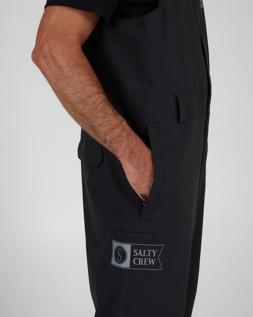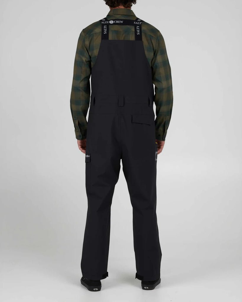 The Long Range Bib in Black is an outwear bib featuring mid-weight 2.5 layer material with DWR coating, 20K waterproof / 20K breathability, fully taped internal seams to prevent water penetration, zippered front entry with tricot lined front pockets, utility pocket and left leg cargo pocket and dual hand warmer pockets at bib opening.