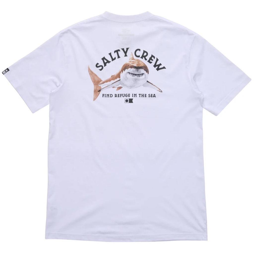 The Lurking Classic Ss Tee in White is made from soft-spun cotton jersey, weighing 180gsm. It features a Salty Crew clamp label at the sleeve hem and is finished with digital-printed designs on both the front and back for a bold, modern look.