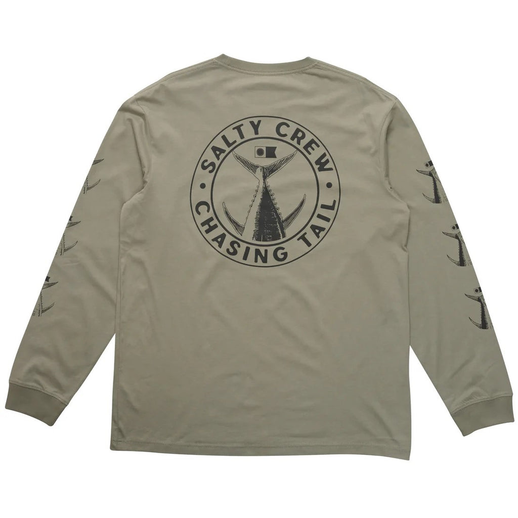 The Tailgate Classic LS Tee in Kelp Green is crafted from soft-spun cotton jersey, weighing 180gsm. It features a Salty Crew clamp label at the sleeve hem and is finished with screen-printed designs on the front, back, and sleeves for a bold, standout look.