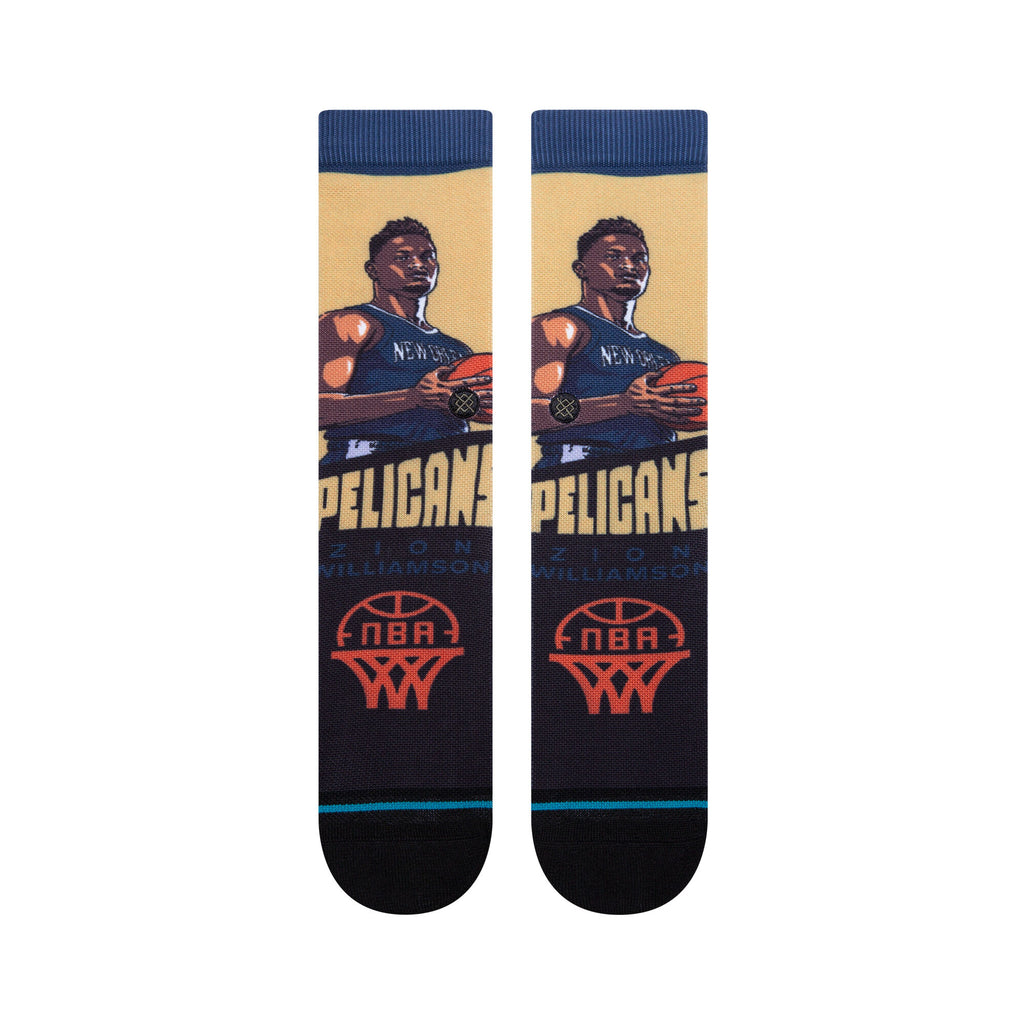 Power forward with these crew socks featuring a bold graphic of the 2019 New Orleans Pelicans first pick, Zion Williamson. Taking design notes from old-school trading cards, these NBA collab socks are made with a pliable poly blend to let your feet breathe and optimize flexibility. They've got a mid-weight cushion for impact protection and all-star support that won't back down.