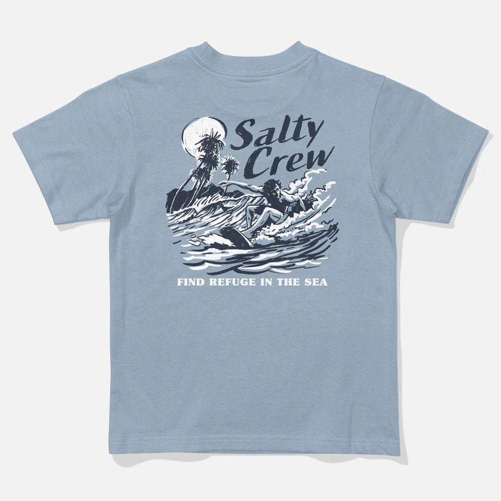 The Surf Camp Toddler SS Tee in Blue Fog is made from 100% Cotton Jersey. It features a rib-knit neckband and screen printed graphics on the front and back.