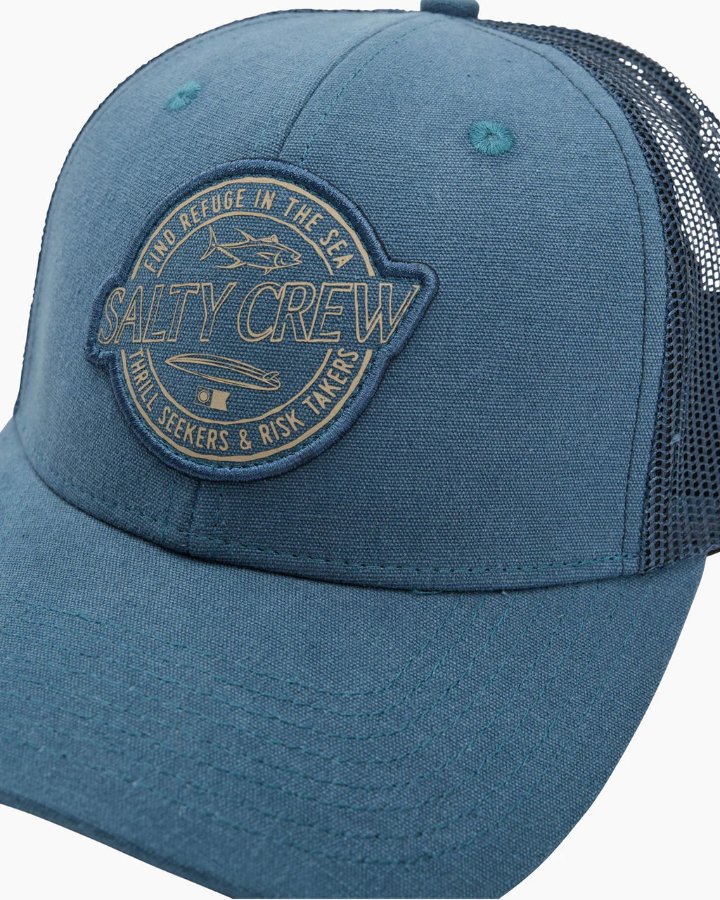 The Skewed Retro Trucker Cap in Pilot Blue is a structured 6-panel, mid-crown height trucker cap. Made from cotton canvas and 100% polyester mesh, it features a woven damask label at the front, a moisture-wicking sweatband, and a plastic snapback closure at the back.